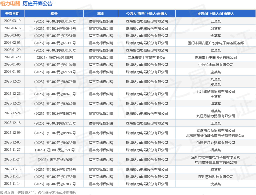 案号:(2025)粤0402民初25396号根据统计,近一年内以珠海格力电器股份有限公司为当事人的历史开庭公告有151则,其中案由为“侵害商标权纠纷”的公告以107则居首,其次为“不正当竞争纠纷”有11则,“买卖合同纠纷”有11则。历史开庭公告(前20条)如下: