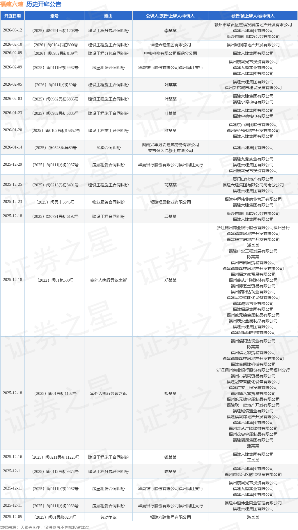 证券之星消息,根据天眼查APP显示,近日公布了一则福建六建集团有限公司作为被告/被上诉人的开庭公告,详细内容如下: