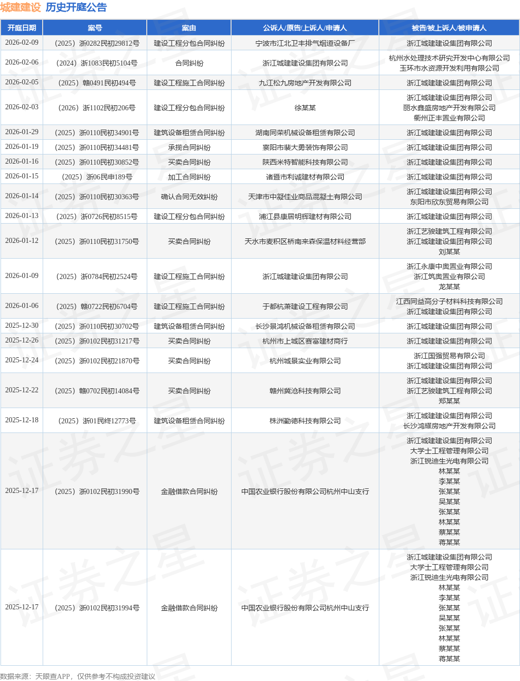 案号:(2025)赣0491民初494号根据统计,近一年内以浙江城建建设集团有限公司为当事人的历史开庭公告有220则,其中案由为“买卖合同纠纷”的公告以60则居首,其次为“建筑设备租赁合同纠纷”有32则,“建设工程施工合同纠纷”有31则。历史开庭公告(前20条)如下:
