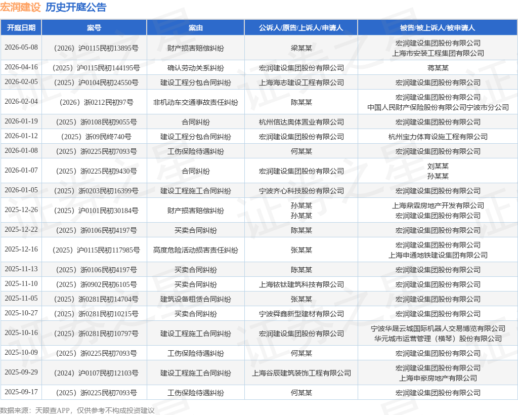 案号:(2025)沪0104民初24550号根据统计,近一年内以宏润建设集团股份有限公司为当事人的历史开庭公告有56则,其中案由为“买卖合同纠纷”的公告以16则居首,其次为“建设工程施工合同纠纷”有10则,“建设工程分包合同纠纷”有7则。历史开庭公告(前20条)如下: