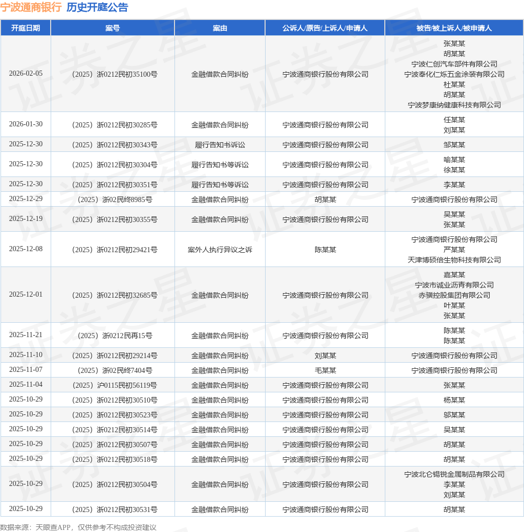 案号:(2025)浙0212民初35100号根据统计,近一年内以宁波通商银行股份有限公司为当事人的历史开庭公告有49则,其中案由为“金融借款合同纠纷”的公告以40则居首,其次为“侵权责任纠纷”有3则,“履行告知书等诉讼”有2则。历史开庭公告(前20条)如下: