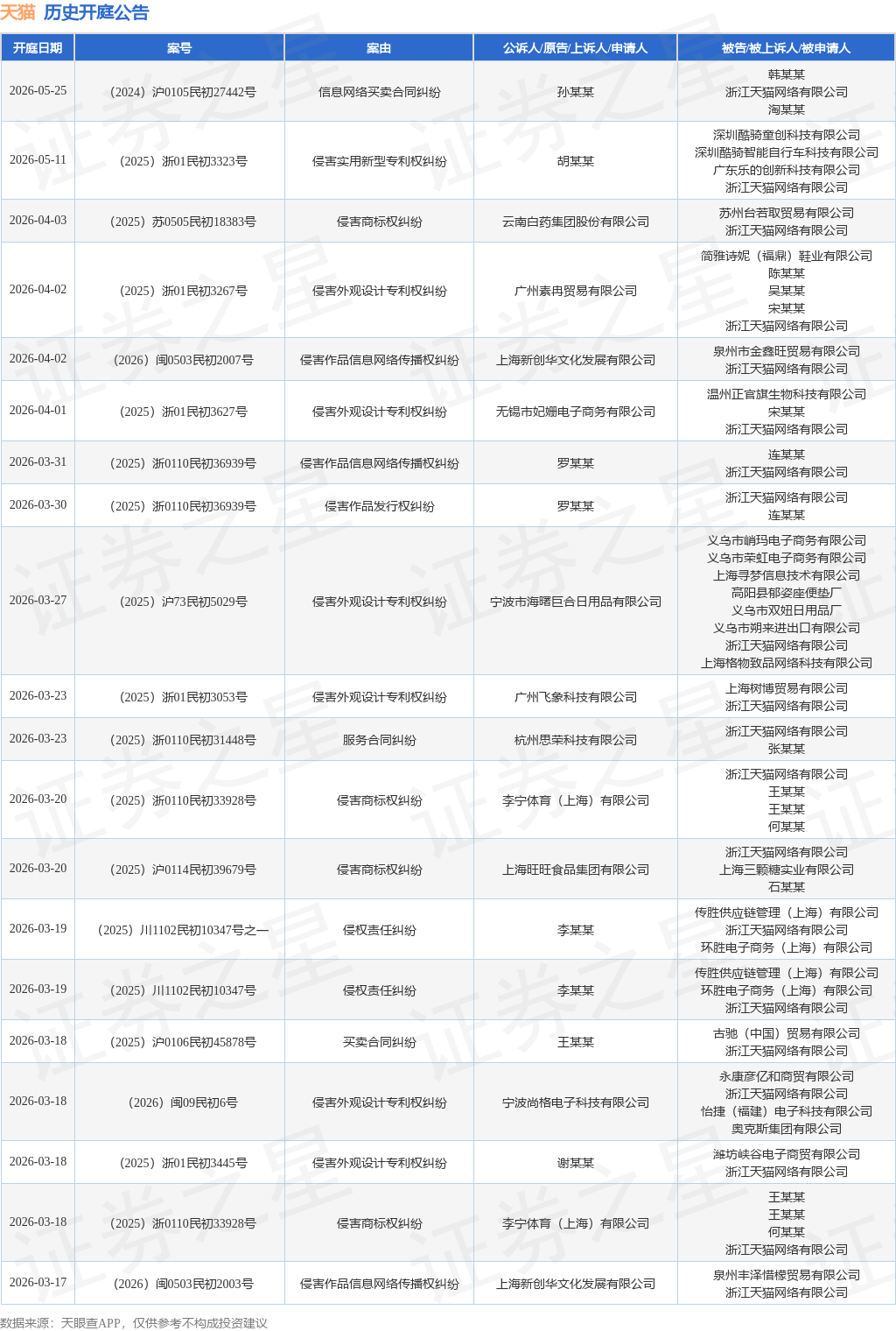 案号:(2025)浙0192民初23654号根据统计,近一年内以浙江天猫网络有限公司为当事人的历史开庭公告有2061则,其中案由为“著作权权属、侵权纠纷”的公告以405则居首,其次为“侵害外观设计专利权纠纷”有327则,“侵害商标权纠纷”有309则。历史开庭公告(前20条)如下: