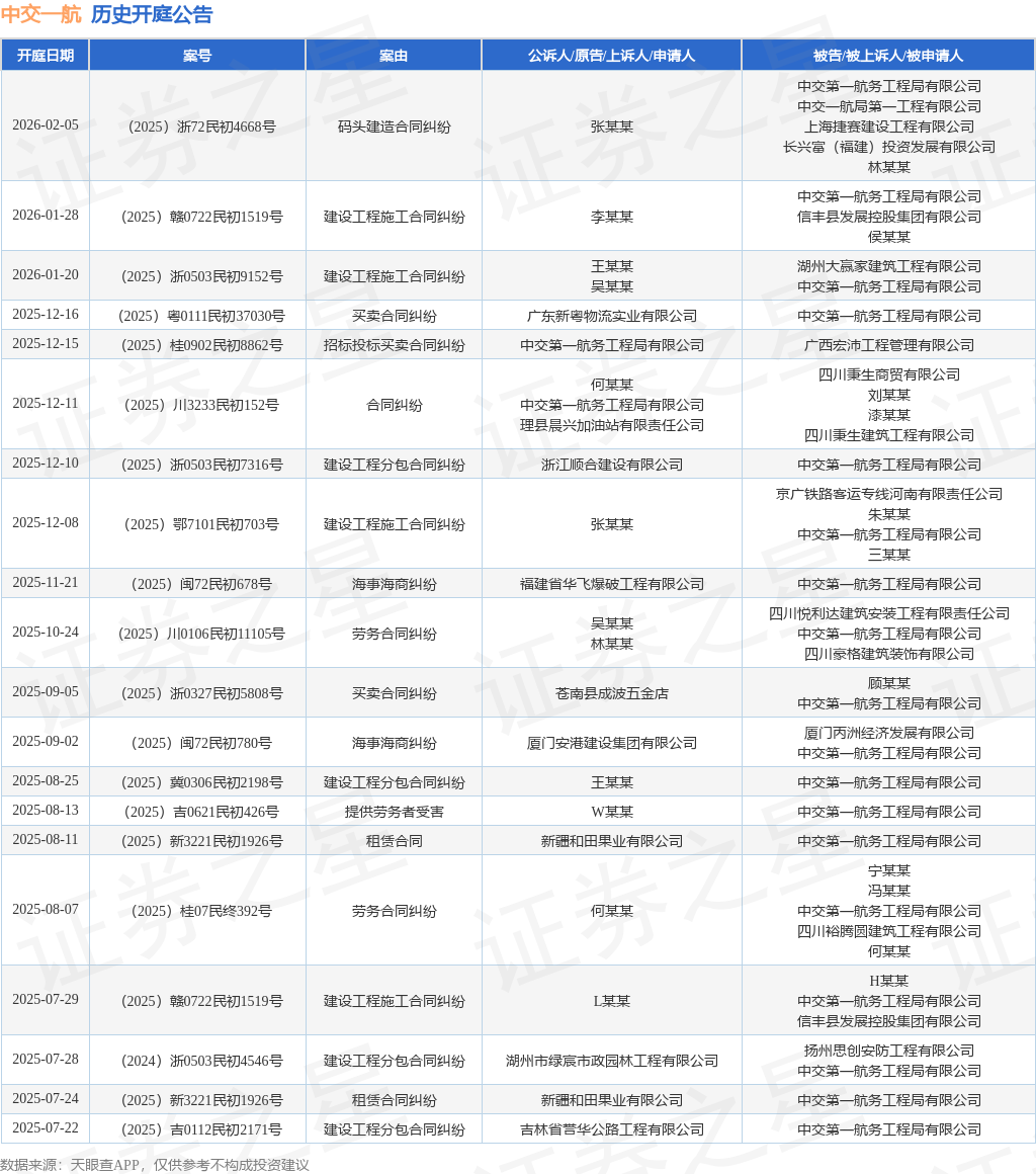 案号:(2025)浙72民初4668号根据统计,近一年内以中交第一航务工程局有限公司为当事人的历史开庭公告有63则,其中案由为“建设工程施工合同纠纷”的公告以14则居首,其次为“建设工程分包合同纠纷”有7则,“财产损害赔偿纠纷”有5则。历史开庭公告(前20条)如下: