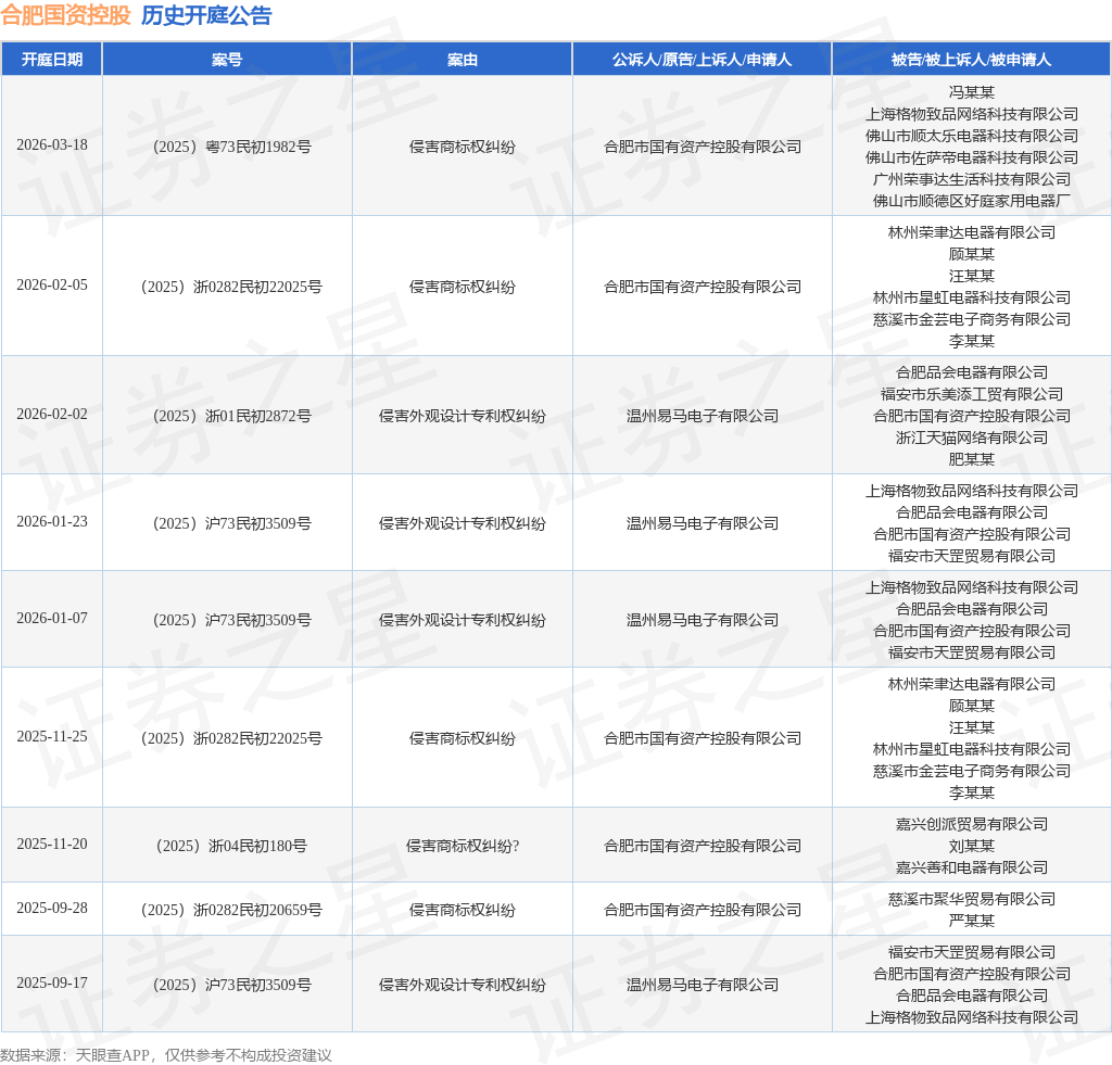 案号:(2025)浙0282民初22025号根据统计,近一年内以合肥市国有资产控股有限公司为当事人的历史开庭公告有9则,其中案由为“侵害商标权纠纷”的公告以4则居首,其次为“侵害外观设计专利权纠纷”有4则,“侵害商标权纠纷?”有1则。历史开庭公告如下: