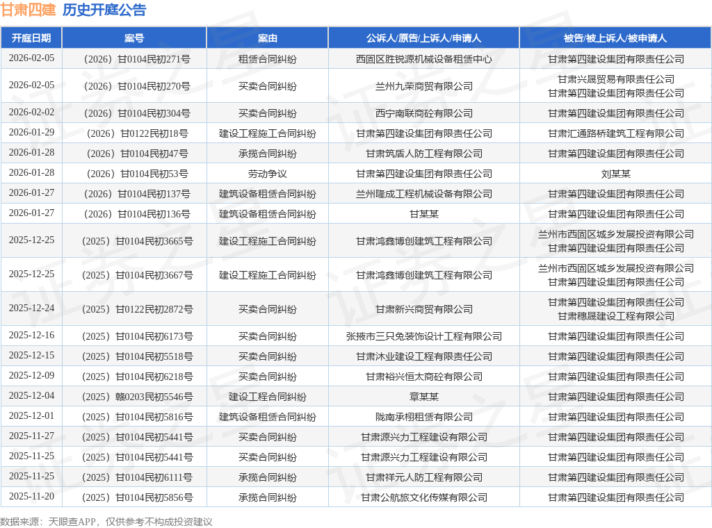 案号:(2026)甘0104民初270号根据统计,近一年内以甘肃第四建设集团有限责任公司为当事人的历史开庭公告有110则,其中案由为“买卖合同纠纷”的公告以54则居首,其次为“建设工程施工合同纠纷”有18则,“建筑设备租赁合同纠纷”有8则。历史开庭公告(前20条)如下: