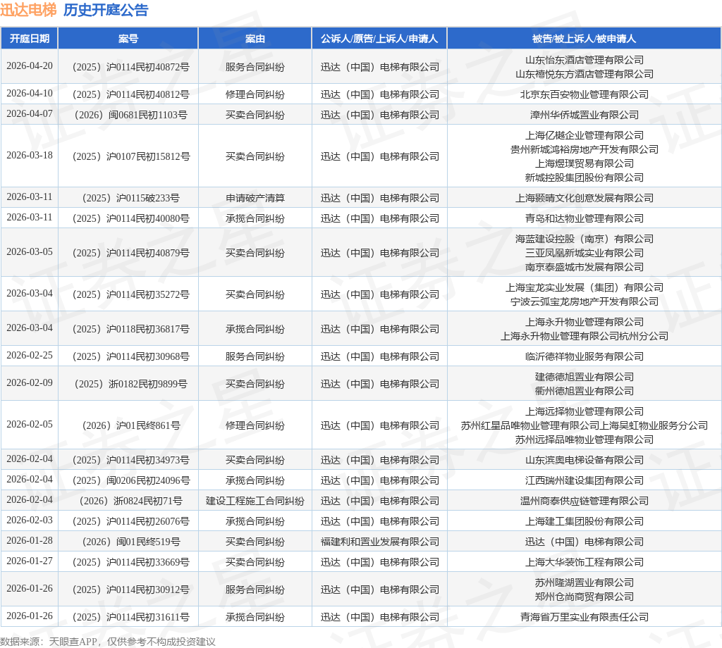 案号:(2026)沪01民终861号根据统计,近一年内以迅达(中国)电梯有限公司为当事人的历史开庭公告有229则,其中案由为“买卖合同纠纷”的公告以130则居首,其次为“承揽合同纠纷”有35则,“修理合同纠纷”有19则。历史开庭公告(前20条)如下: