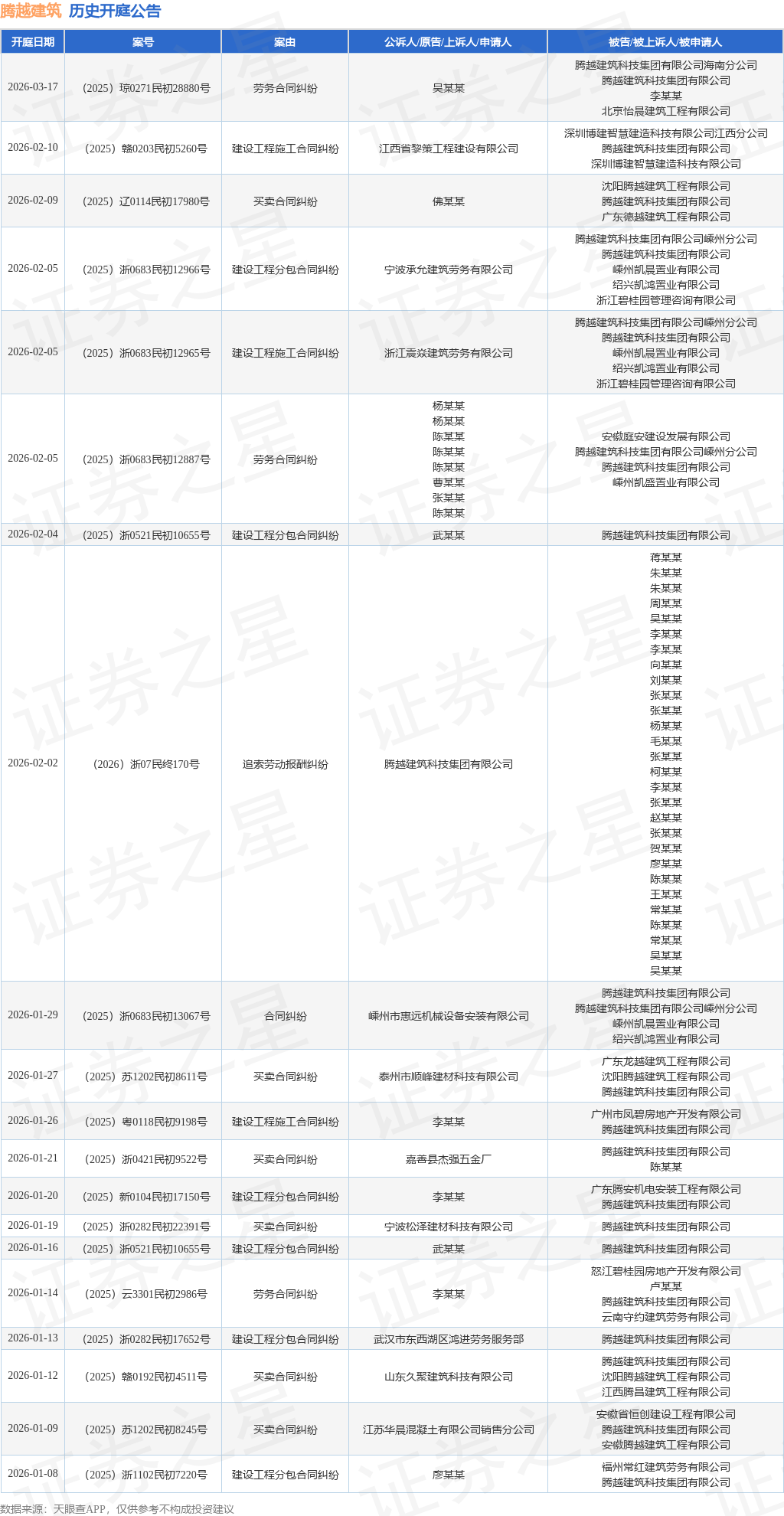 案号:(2025)浙0683民初12966号根据统计,近一年内以腾越建筑科技集团有限公司为当事人的历史开庭公告有366则,其中案由为“买卖合同纠纷”的公告以72则居首,其次为“建设工程施工合同纠纷”有64则,“建设工程分包合同纠纷”有59则。历史开庭公告(前20条)如下:
