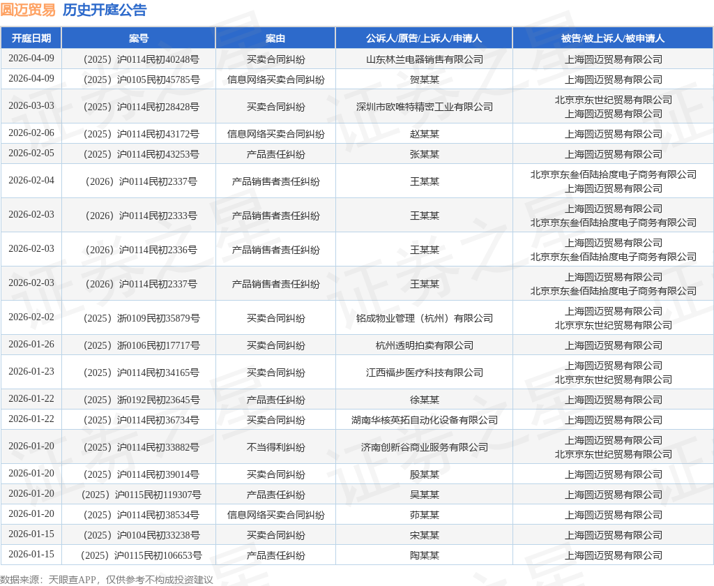 案号:(2025)沪0114民初43253号根据统计,近一年内以上海圆迈贸易有限公司为当事人的历史开庭公告有145则,其中案由为“信息网络买卖合同纠纷”的公告以64则居首,其次为“买卖合同纠纷”有32则,“产品责任纠纷”有21则。历史开庭公告(前20条)如下: