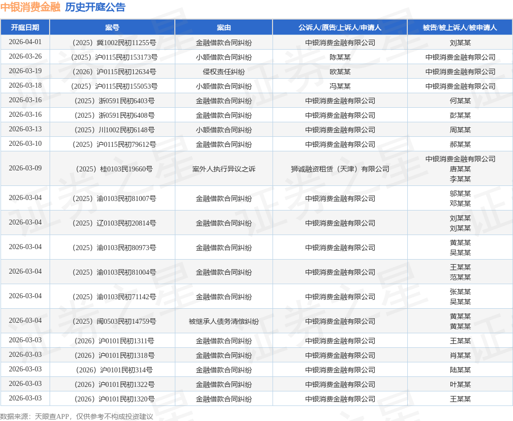 案号:(2025)浙0382民初21503号根据统计,近一年内以中银消费金融有限公司为当事人的历史开庭公告有7129则,其中案由为“金融借款合同纠纷”的公告以5675则居首,其次为“借款合同纠纷”有995则,“小额借款合同纠纷”有395则。历史开庭公告(前20条)如下:
