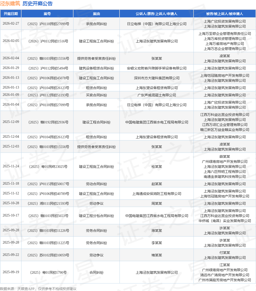 案号:(2026)沪0112民初1516号根据统计,近一年内以上海泾东建筑发展有限公司为当事人的历史开庭公告有83则,其中案由为“建设工程分包合同纠纷”的公告以16则居首,其次为“劳务合同纠纷”有15则,“买卖合同纠纷”有12则。历史开庭公告(前20条)如下: