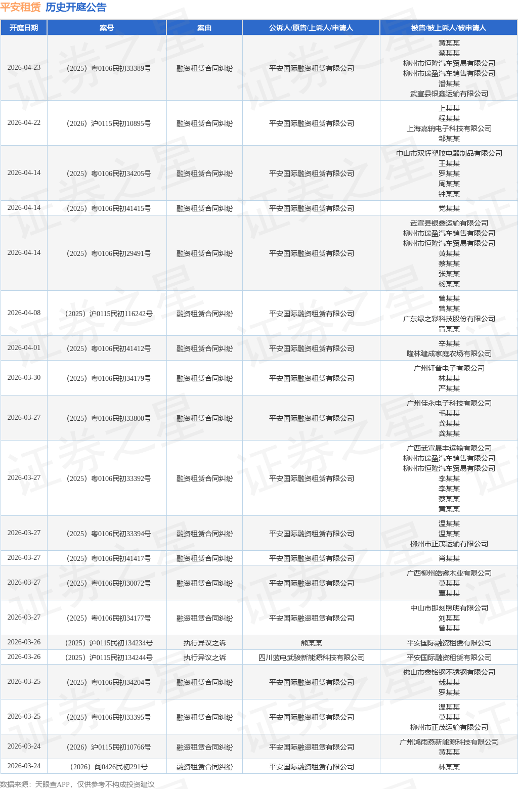 案号:(2025)粤0391民初11287号根据统计,近一年内以平安国际融资租赁有限公司为当事人的历史开庭公告有884则,其中案由为“融资租赁合同纠纷”的公告以826则居首,其次为“破产债权确认纠纷”有9则,“合同纠纷”有8则。历史开庭公告(前20条)如下:
