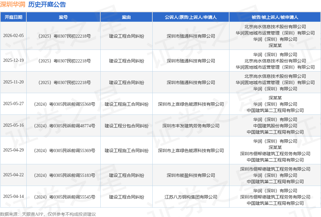 案号:(2025)粤0307民初22218号根据统计,近一年内以华润(深圳)有限公司为当事人的历史开庭公告有8则,其中案由为“建设工程合同纠纷”的公告以5则居首,其次为“建设工程施工合同纠纷”有2则,“建设工程分包合同纠纷”有1则。历史开庭公告如下:
