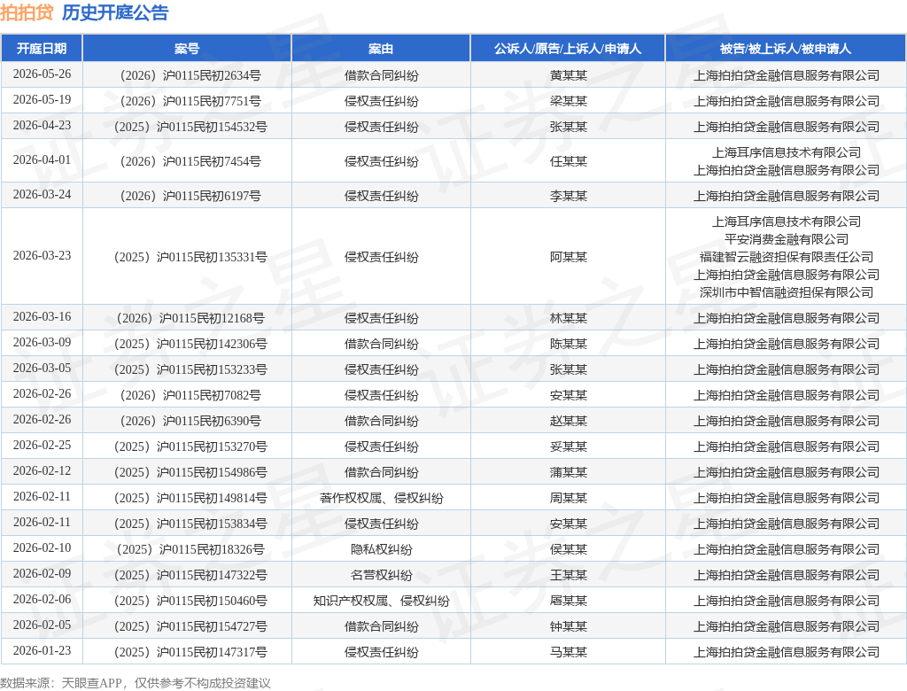 案号:(2025)沪0115民初154727号根据统计,近一年内以上海拍拍贷金融信息服务有限公司为当事人的历史开庭公告有118则,其中案由为“侵权责任纠纷”的公告以30则居首,其次为“借款合同纠纷”有29则,“个人信息保护纠纷”有15则。历史开庭公告(前20条)如下: