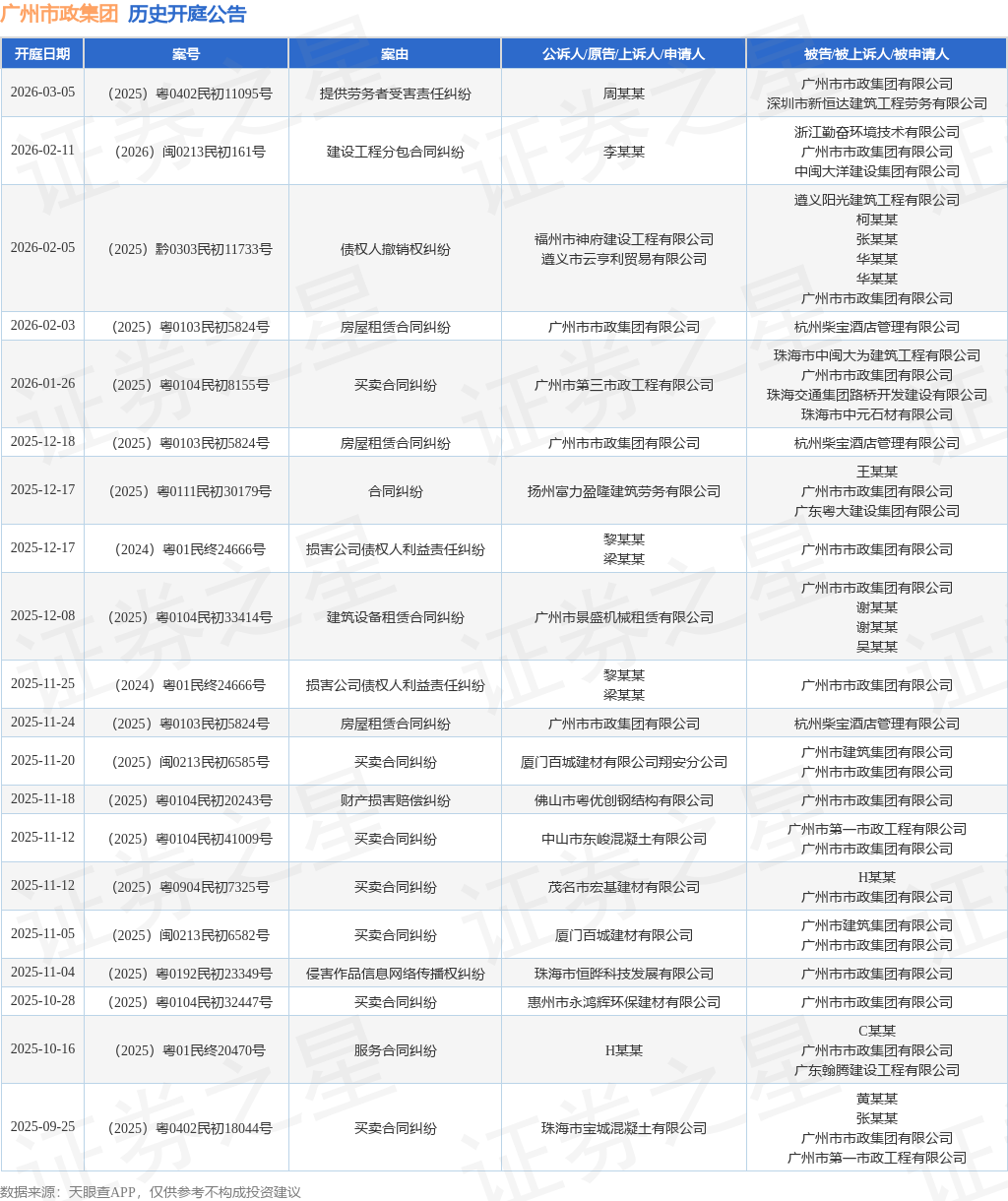 案号:(2025)黔0303民初11733号根据统计,近一年内以广州市市政集团有限公司为当事人的历史开庭公告有103则,其中案由为“买卖合同纠纷”的公告以46则居首,其次为“损害公司债权人利益责任纠纷”有12则,“建设工程施工合同纠纷”有5则。历史开庭公告(前20条)如下: