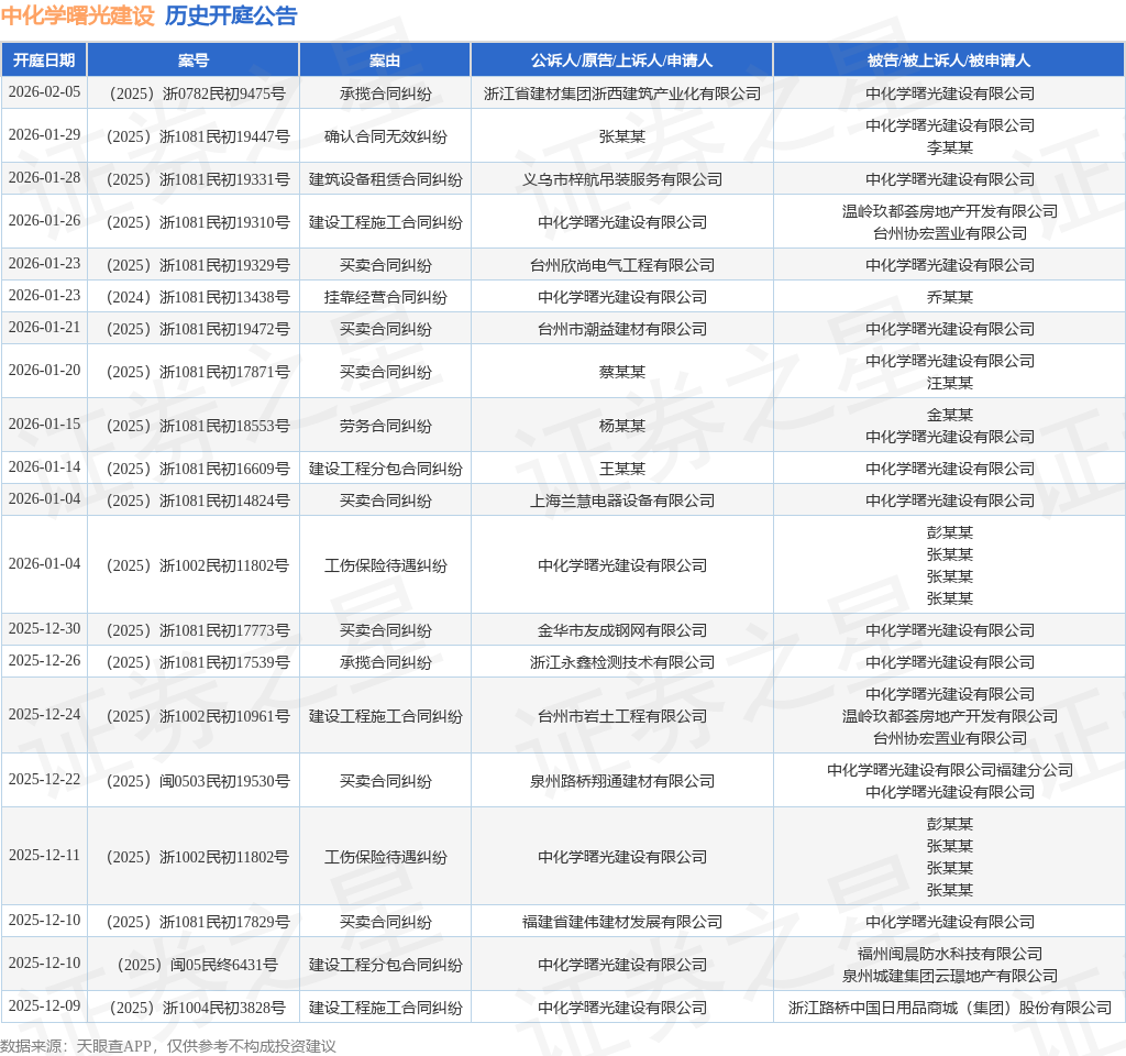 案号:(2025)浙0782民初9475号根据统计,近一年内以中化学曙光建设有限公司为当事人的历史开庭公告有128则,其中案由为“买卖合同纠纷”的公告以30则居首,其次为“建设工程施工合同纠纷”有29则,“建设工程分包合同纠纷”有17则。历史开庭公告(前20条)如下: