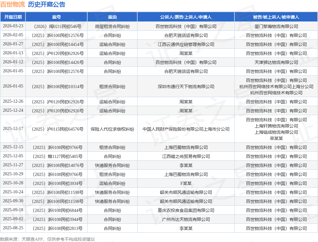 案号:(2025)浙0108民初12576号根据统计,近一年内以百世物流科技(中国)有限公司为当事人的历史开庭公告有33则,其中案由为“合同纠纷”的公告以12则居首,其次为“运输合同纠纷”有8则,“快递服务合同纠纷”有3则。历史开庭公告(前20条)如下: