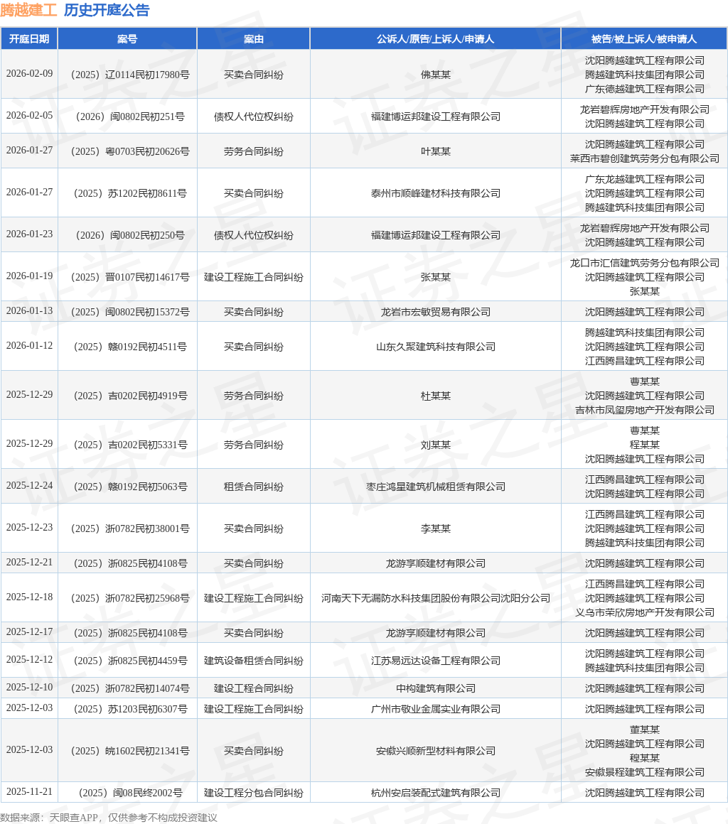 案号:(2026)闽0802民初251号根据统计,近一年内以沈阳腾越建筑工程有限公司为当事人的历史开庭公告有289则,其中案由为“买卖合同纠纷”的公告以73则居首,其次为“建设工程施工合同纠纷”有65则,“建设工程分包合同纠纷”有36则。历史开庭公告(前20条)如下: