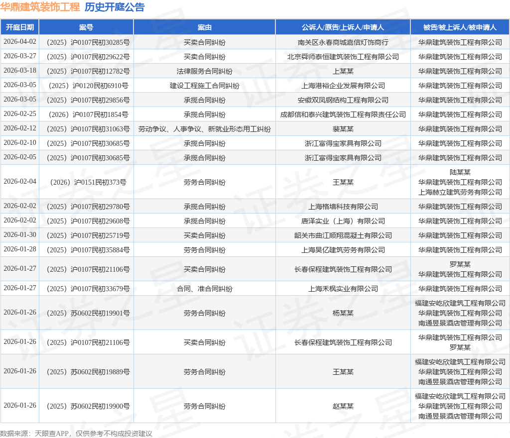 案号:(2025)沪0107民初30685号根据统计,近一年内以华鼎建筑装饰工程有限公司为当事人的历史开庭公告有185则,其中案由为“买卖合同纠纷”的公告以73则居首,其次为“建设工程施工合同纠纷”有20则,“劳动合同纠纷”有18则。历史开庭公告(前20条)如下: