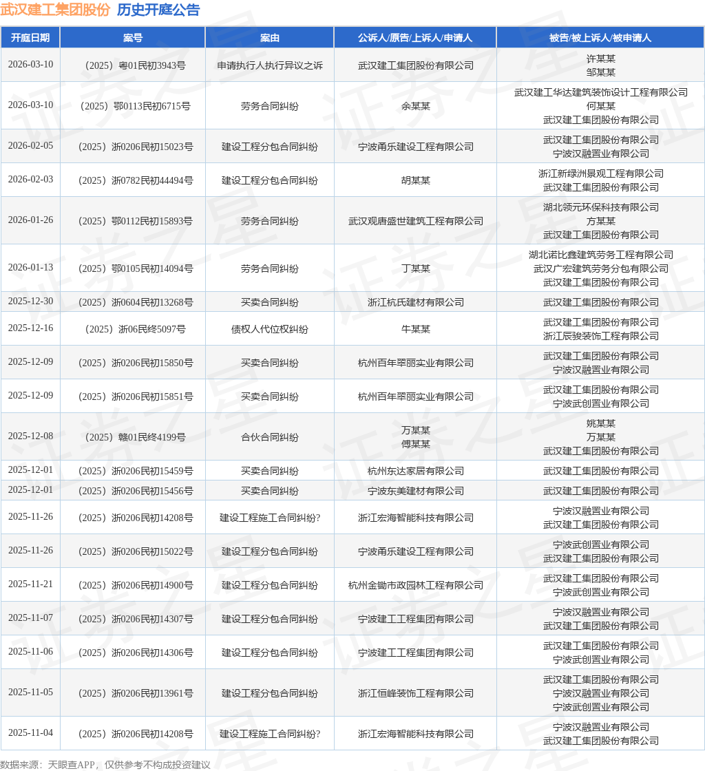 案号:(2025)浙0206民初15023号根据统计,近一年内以武汉建工集团股份有限公司为当事人的历史开庭公告有100则,其中案由为“劳务合同纠纷”的公告以28则居首,其次为“建设工程分包合同纠纷”有16则,“买卖合同纠纷”有9则。历史开庭公告(前20条)如下: