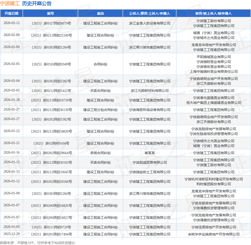 案号:(2025)浙0326民初9349号根据统计,近一年内以宁波建工工程集团有限公司为当事人的历史开庭公告有148则,其中案由为“建设工程施工合同纠纷”的公告以44则居首,其次为“买卖合同纠纷”有30则,“建设工程合同纠纷”有24则。历史开庭公告(前20条)如下: