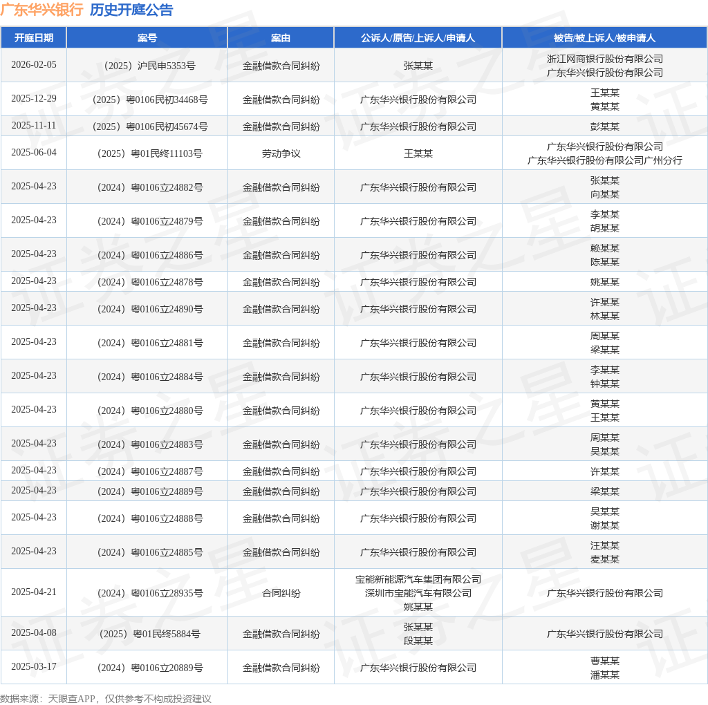 案号:(2025)沪民申5353号根据统计,近一年内以广东华兴银行股份有限公司为当事人的历史开庭公告有24则,其中案由为“金融借款合同纠纷”的公告以22则居首,其次为“劳动争议”有1则,“合同纠纷”有1则。历史开庭公告(前20条)如下: