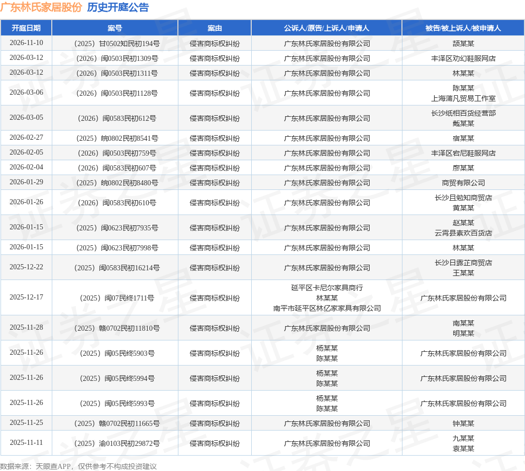 案号:(2026)闽0503民初759号根据统计,近一年内以广东林氏家居股份有限公司为当事人的历史开庭公告有61则,其中案由为“侵害商标权纠纷”的公告以52则居首,其次为“侵害外观设计专利权纠纷”有6则,“侵害作品放映权纠纷”有1则。历史开庭公告(前20条)如下:
