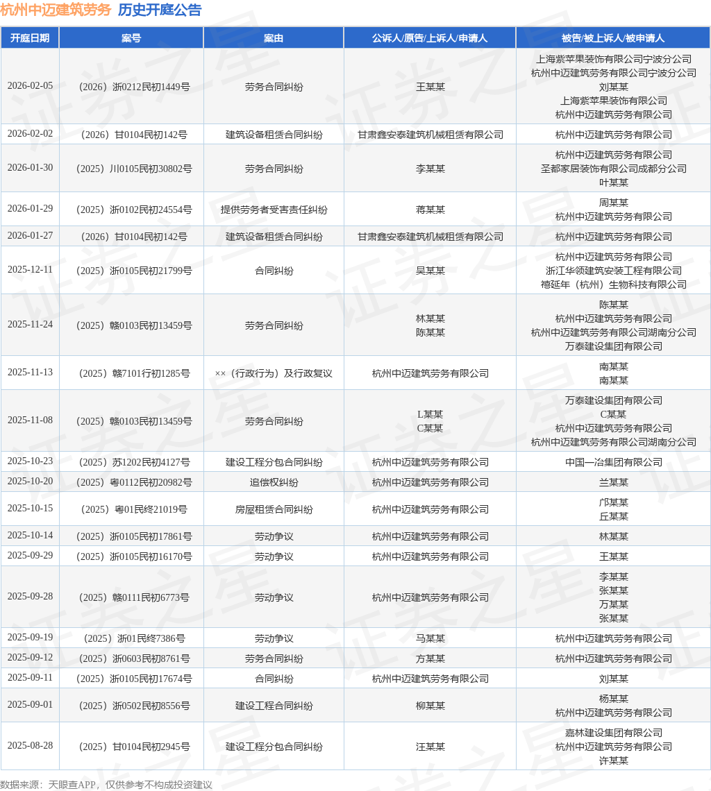 案号:(2026)浙0212民初1449号根据统计,近一年内以杭州中迈建筑劳务有限公司为当事人的历史开庭公告有48则,其中案由为“建设工程分包合同纠纷”的公告以10则居首,其次为“劳务合同纠纷”有8则,“劳动争议”有7则。历史开庭公告(前20条)如下: