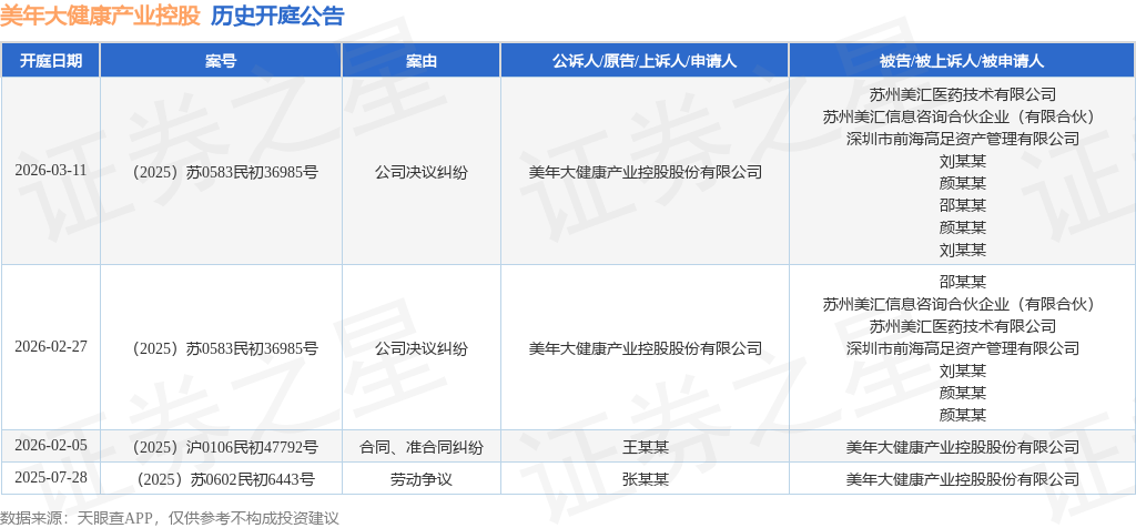 案号:(2025)沪0106民初47792号根据统计,近一年内以美年大健康产业控股股份有限公司为当事人的历史开庭公告有4则,其中案由为“公司决议纠纷”的公告以2则居首,其次为“劳动争议”有1则,“合同、准合同纠纷”有1则。历史开庭公告如下: