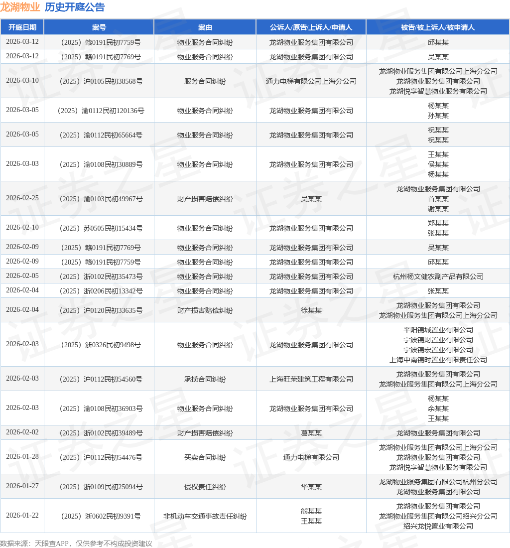 案号:(2025)浙0102民初35473号根据统计,近一年内以龙湖物业服务集团有限公司为当事人的历史开庭公告有329则,其中案由为“物业服务合同纠纷”的公告以183则居首,其次为“财产损害赔偿纠纷”有31则,“服务合同纠纷”有24则。历史开庭公告(前20条)如下: