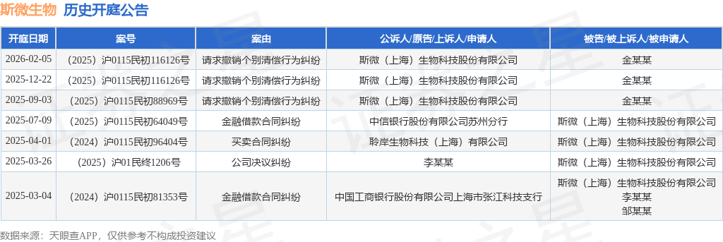 案号:(2025)沪0115民初116126号根据统计,近一年内以斯微(上海)生物科技股份有限公司为当事人的历史开庭公告有7则,其中案由为“请求撤销个别清偿行为纠纷”的公告以3则居首,其次为“金融借款合同纠纷”有2则,“买卖合同纠纷”有1则。历史开庭公告如下: