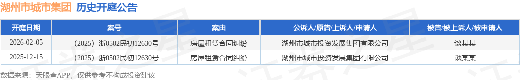 根据统计,近一年内以湖州市城市投资发展集团有限公司为当事人的历史开庭公告有2则,其中案由为“房屋租赁合同纠纷”的公告以2则居首。历史开庭公告如下: