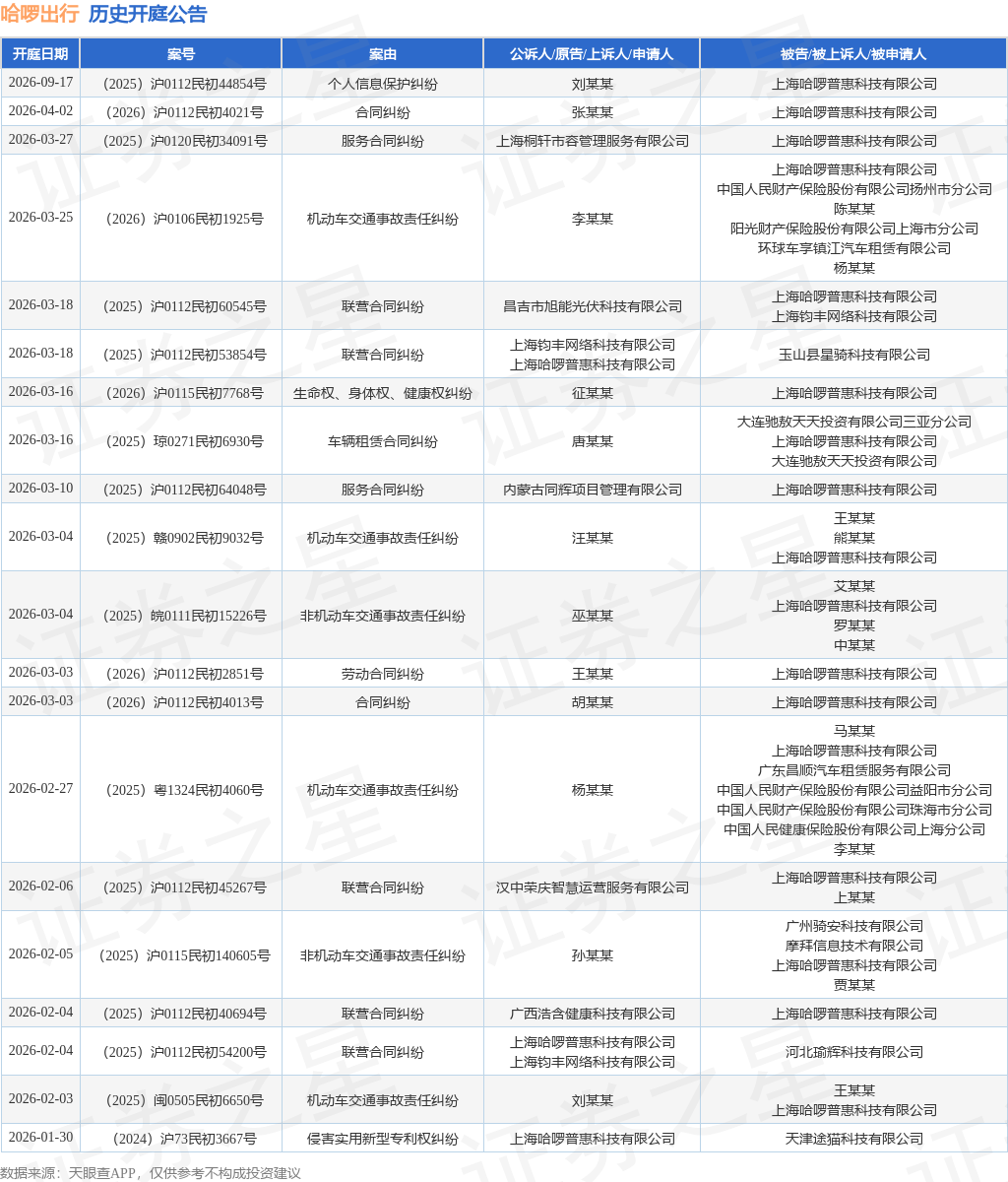 案号:(2025)沪0115民初140605号根据统计,近一年内以上海哈啰普惠科技有限公司为当事人的历史开庭公告有283则,其中案由为“机动车交通事故责任纠纷”的公告以67则居首,其次为“合同纠纷”有51则,“联营合同纠纷”有39则。历史开庭公告(前20条)如下: