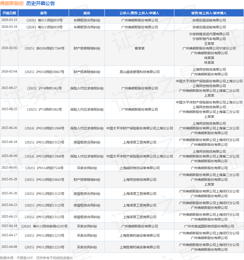 案号:(2025)浙0206民初17560号根据统计,近一年内以广州佛朗斯股份有限公司为当事人的历史开庭公告有17则,其中案由为“买卖合同纠纷”的公告以4则居首,其次为“保险人代位求偿权纠纷”有4则,“房屋租赁合同纠纷”有4则。历史开庭公告如下: