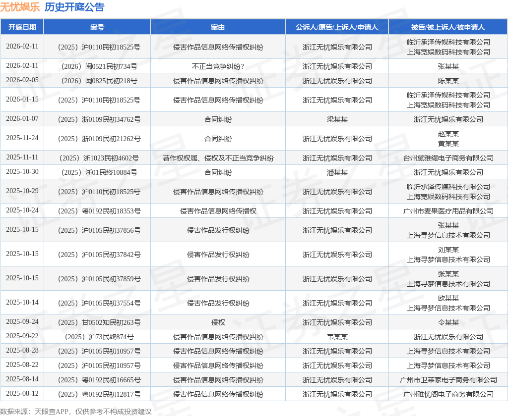 案号:(2026)闽0825民初218号根据统计,近一年内以浙江无忧娱乐有限公司为当事人的历史开庭公告有54则,其中案由为“侵害作品信息网络传播权纠纷”的公告以28则居首,其次为“著作权权属、侵权纠纷”有7则,“侵害作品发行权纠纷”有4则。历史开庭公告(前20条)如下: