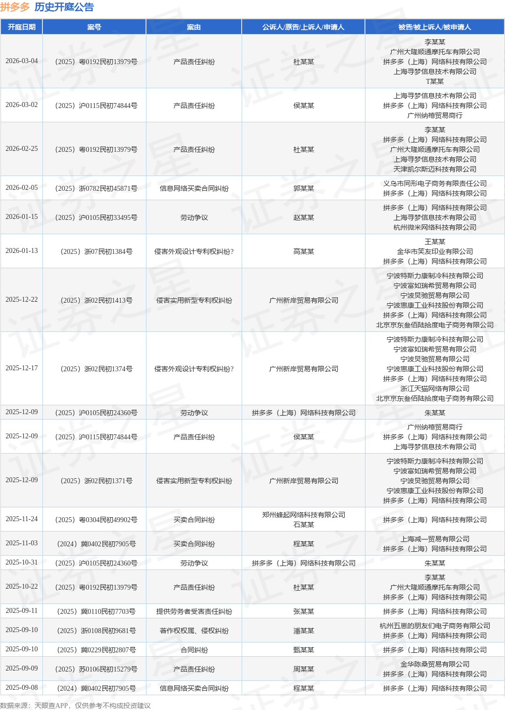 案号:(2025)浙0782民初45871号根据统计,近一年内以拼多多(上海)网络科技有限公司为当事人的历史开庭公告有59则,其中案由为“产品责任纠纷”的公告以17则居首,其次为“买卖合同纠纷”有13则,“信息网络买卖合同纠纷”有12则。历史开庭公告(前20条)如下: