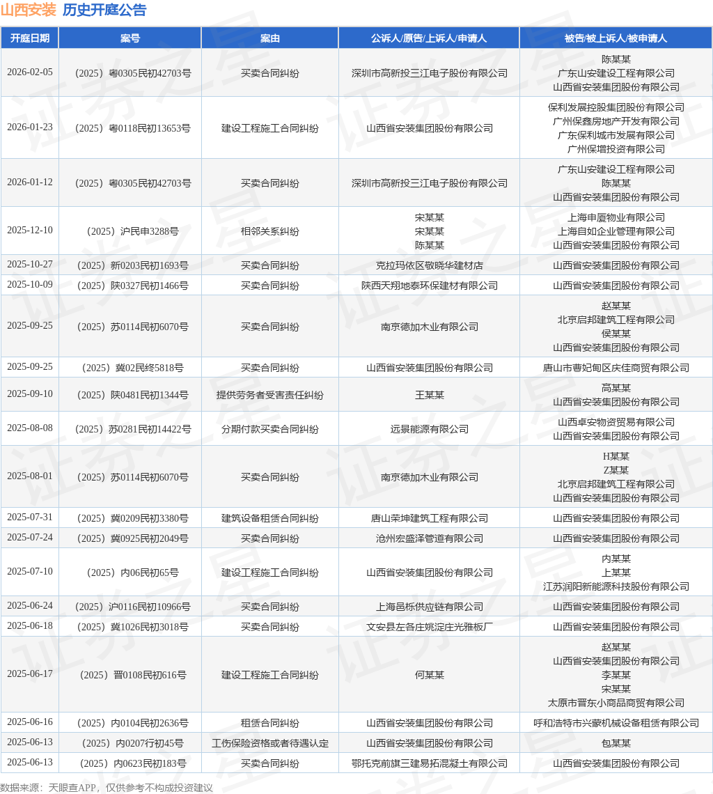 案号:(2025)粤0305民初42703号根据统计,近一年内以山西省安装集团股份有限公司为当事人的历史开庭公告有42则,其中案由为“买卖合同纠纷”的公告以21则居首,其次为“建设工程施工合同纠纷”有6则,“建筑设备租赁合同纠纷”有3则。历史开庭公告(前20条)如下: