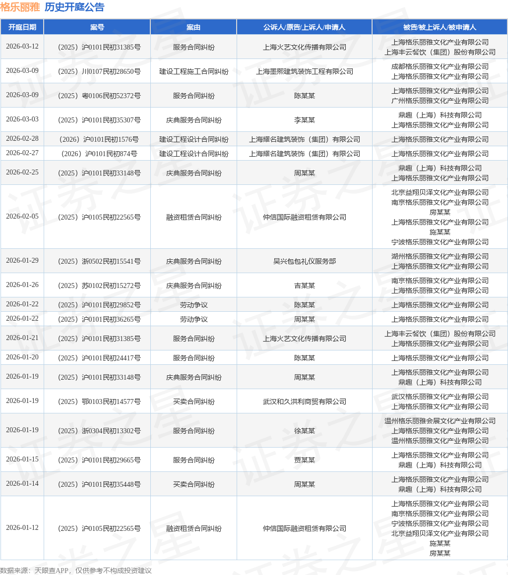 案号:(2025)沪0105民初22565号根据统计,近一年内以上海格乐丽雅文化产业有限公司为当事人的历史开庭公告有180则,其中案由为“服务合同纠纷”的公告以53则居首,其次为“买卖合同纠纷”有34则,“庆典服务合同纠纷”有20则。历史开庭公告(前20条)如下: