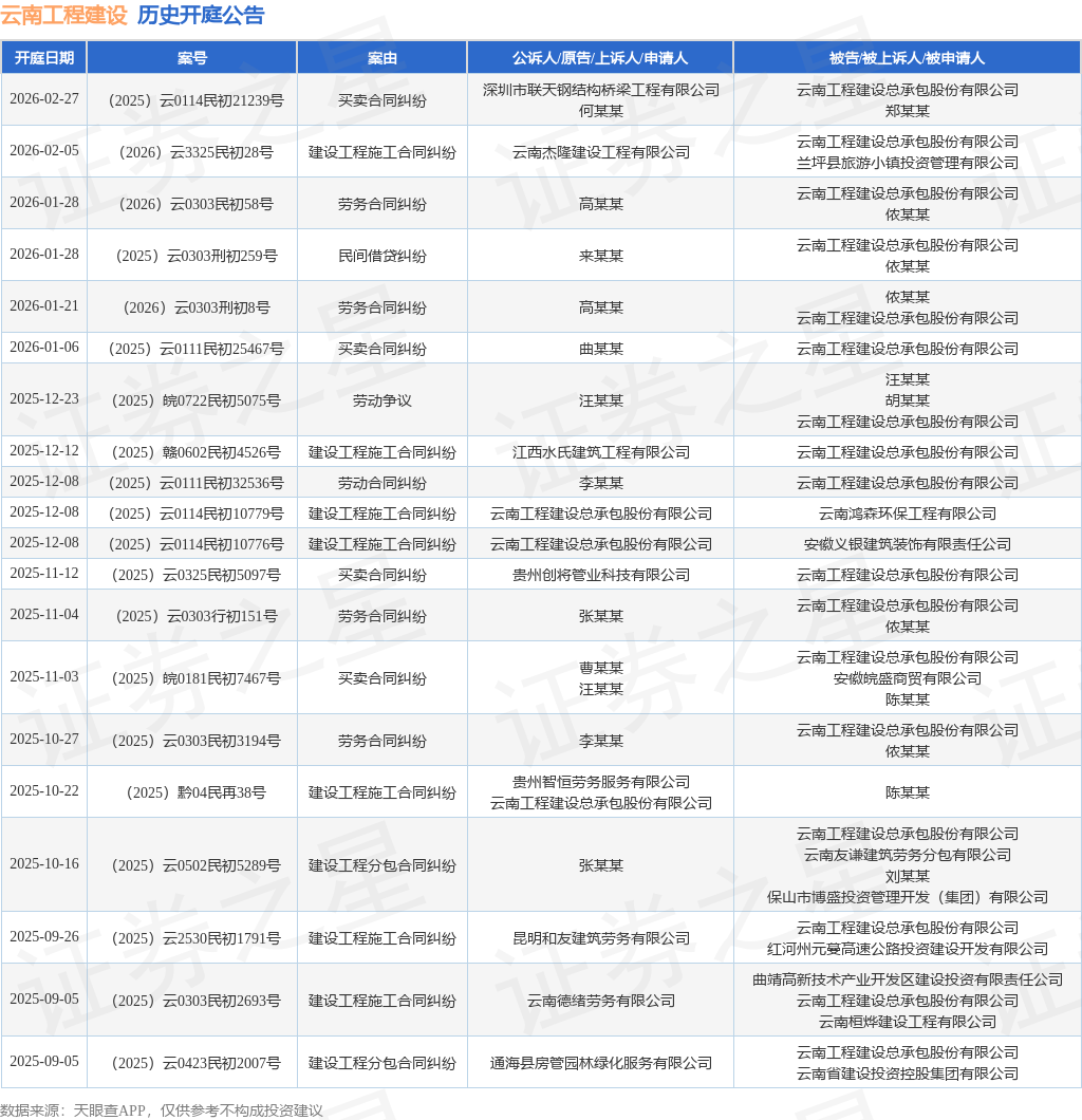 案号:(2026)云3325民初28号根据统计,近一年内以云南工程建设总承包股份有限公司为当事人的历史开庭公告有63则,其中案由为“建设工程施工合同纠纷”的公告以26则居首,其次为“买卖合同纠纷”有11则,“劳务合同纠纷”有10则。历史开庭公告(前20条)如下: