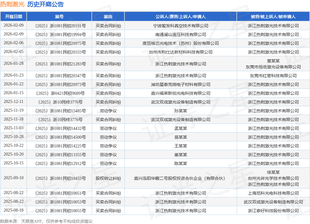 证券之星消息,根据天眼查APP显示,近日公布了一则浙江热刺激光技术有限公司作为被告/被上诉人的开庭公告,详细内容如下: