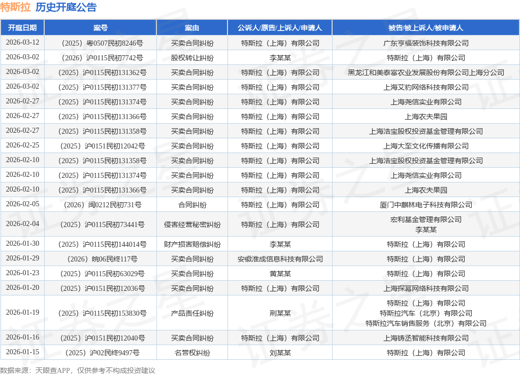 案号:(2026)闽0212民初731号根据统计,近一年内以特斯拉(上海)有限公司为当事人的历史开庭公告有172则,其中案由为“买卖合同纠纷”的公告以90则居首,其次为“合同纠纷”有17则,“服务合同纠纷”有9则。历史开庭公告(前20条)如下:
