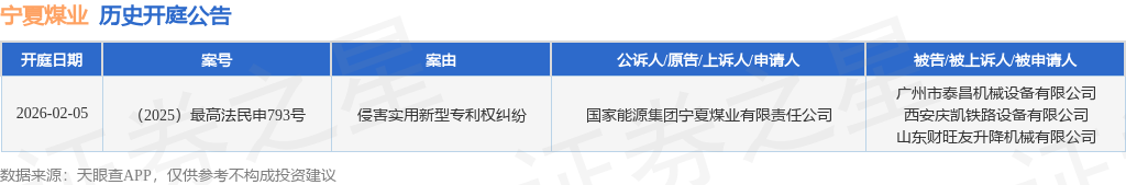 根据统计,近一年内以国家能源集团宁夏煤业有限责任公司为当事人的历史开庭公告有1则,其中案由为“侵害实用新型专利权纠纷”的公告以1则居首。历史开庭公告如下: