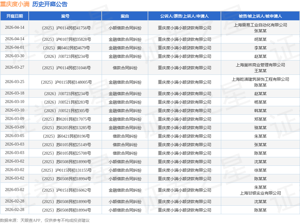 案号:(2025)沪0115民初148004号根据统计,近一年内以重庆度小满小额贷款有限公司为当事人的历史开庭公告有1497则,其中案由为“小额借款合同纠纷”的公告以603则居首,其次为“金融借款合同纠纷”有427则,“借款合同纠纷”有255则。历史开庭公告(前20条)如下: