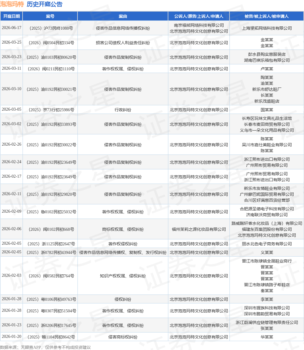 案号:(2025)浙0782民初43944号根据统计,近一年内以北京泡泡玛特文化创意有限公司为当事人的历史开庭公告有108则,其中案由为“著作权权属、侵权纠纷”的公告以33则居首,其次为“侵害作品复制权纠纷”有23则,“侵害商标权纠纷”有13则。历史开庭公告(前20条)如下: