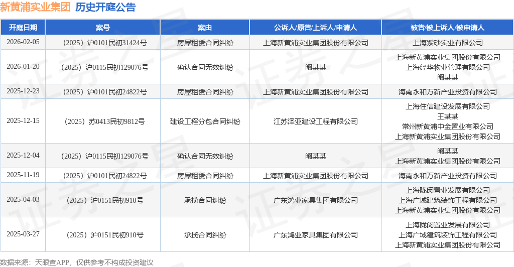 案号:(2025)沪0101民初31424号根据统计,近一年内以上海新黄浦实业集团股份有限公司为当事人的历史开庭公告有8则,其中案由为“房屋租赁合同纠纷”的公告以3则居首,其次为“承揽合同纠纷”有2则,“确认合同无效纠纷”有2则。历史开庭公告如下: