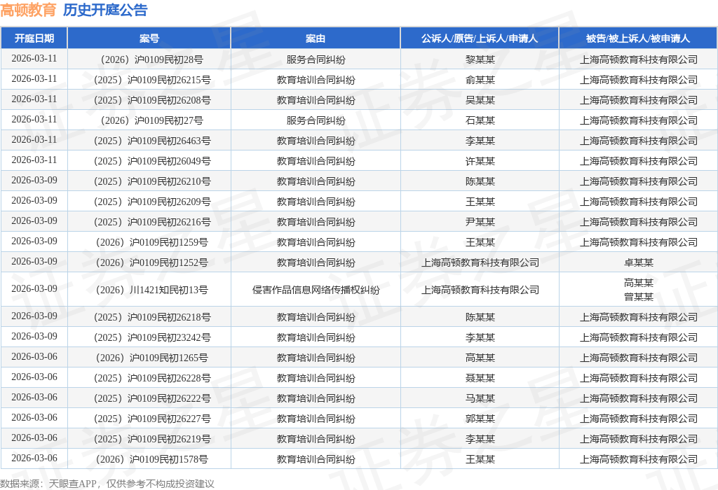 案号:(2025)沪0110民初28795号根据统计,近一年内以上海高顿教育科技有限公司为当事人的历史开庭公告有330则,其中案由为“教育培训合同纠纷”的公告以284则居首,其次为“著作权权属、侵权纠纷”有14则,“侵害作品信息网络传播权纠纷”有12则。历史开庭公告(前20条)如下: