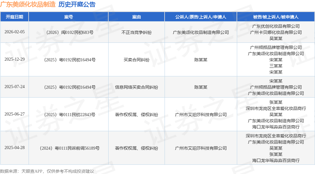 案号:(2026)闽0102民初683号根据统计,近一年内以广东美颂化妆品制造有限公司为当事人的历史开庭公告有5则,其中案由为“著作权权属、侵权纠纷”的公告以2则居首,其次为“不正当竞争纠纷”有1则,“买卖合同纠纷”有1则。历史开庭公告如下: