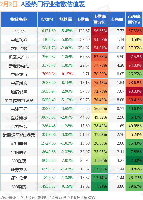 热门行业指数方面,半导体的市盈率百分位较高,为96.63%。而800消费的市盈率百分位较低,为7.94%。