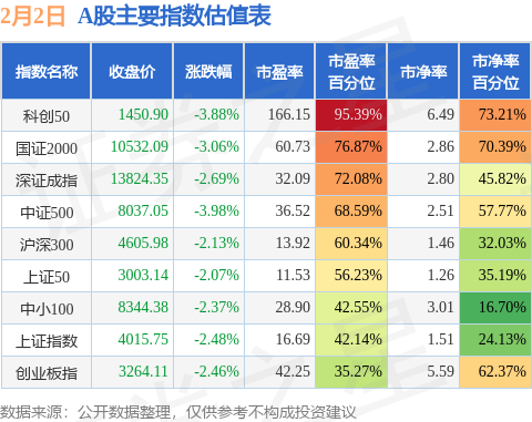 证券之星消息,2月2日A股收盘,上证综指指跌2.48%,报收4015.75点;深圳成指跌2.69%,报收13824.35点;创业板指跌2.46%,报收3264.11点。