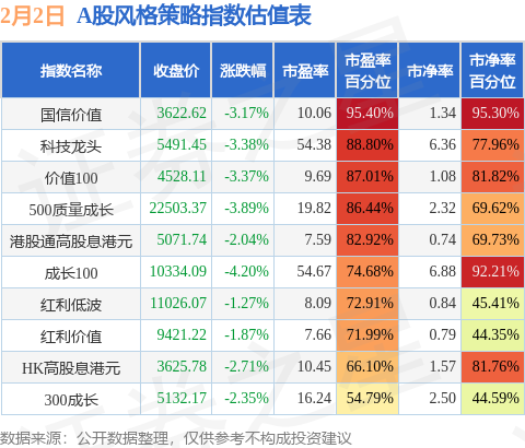 风格策略指数方面,国信价值的市盈率百分位较高,为95.4%。而300成长的市盈率百分位较低,为54.79%。