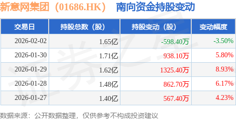 证券之星消息,2月2日南向资金减持598.4万股新意网集团(01686.HK)。近5个交易日中,获南向资金增持的有4天,累计净增持3095.2万股。近20个交易日中,获南向资金增持的有14天,累计净增持7789.2万股。截至目前,南向资金持有新意网集团(01686.HK)1.65亿股,占公司已发行普通股的6.98%。
